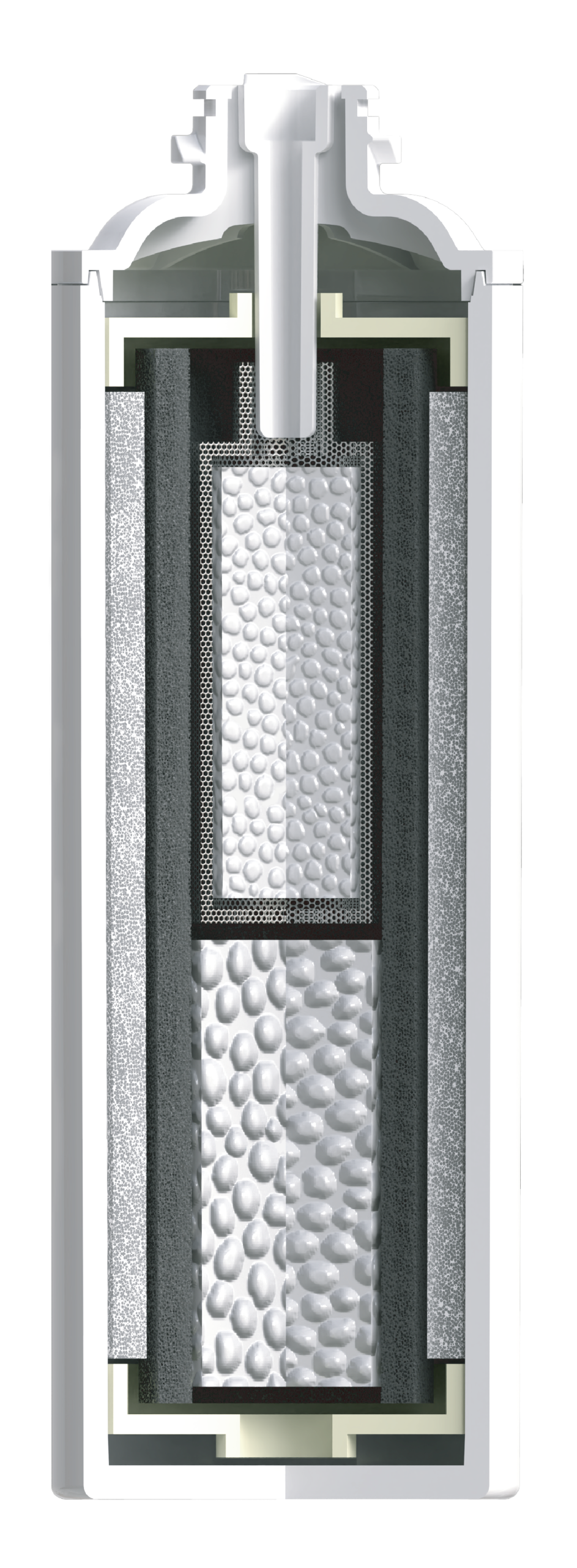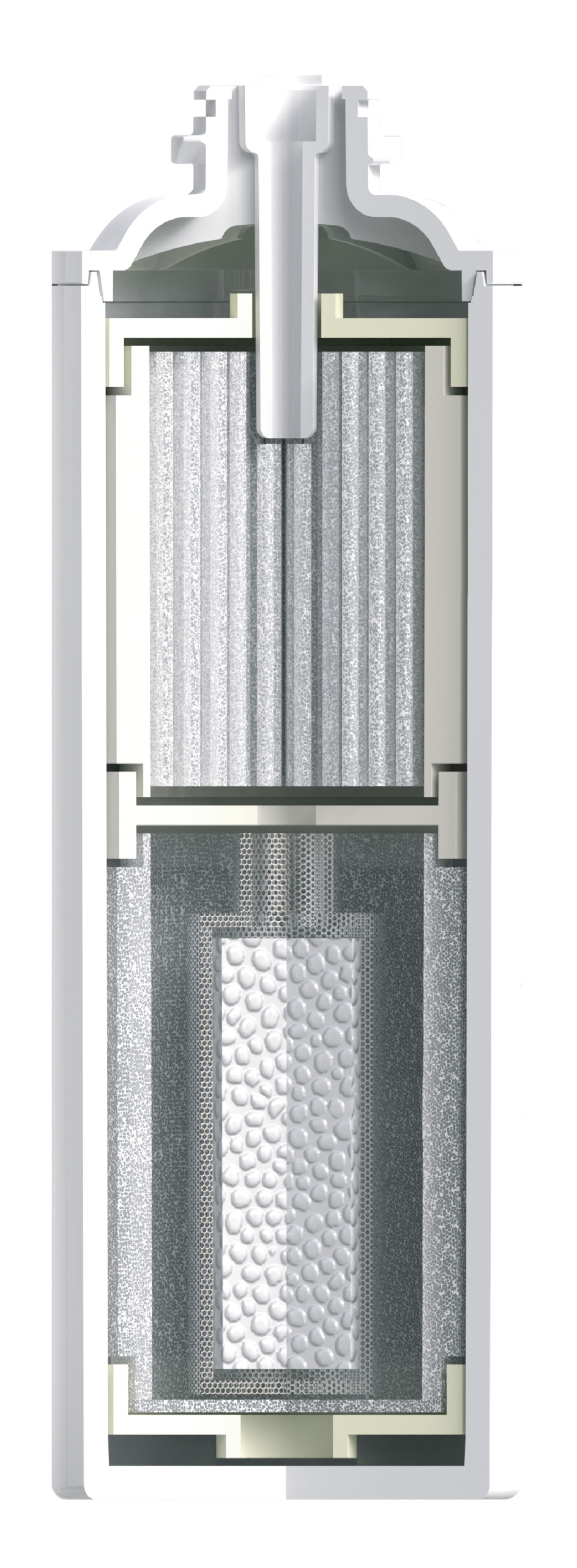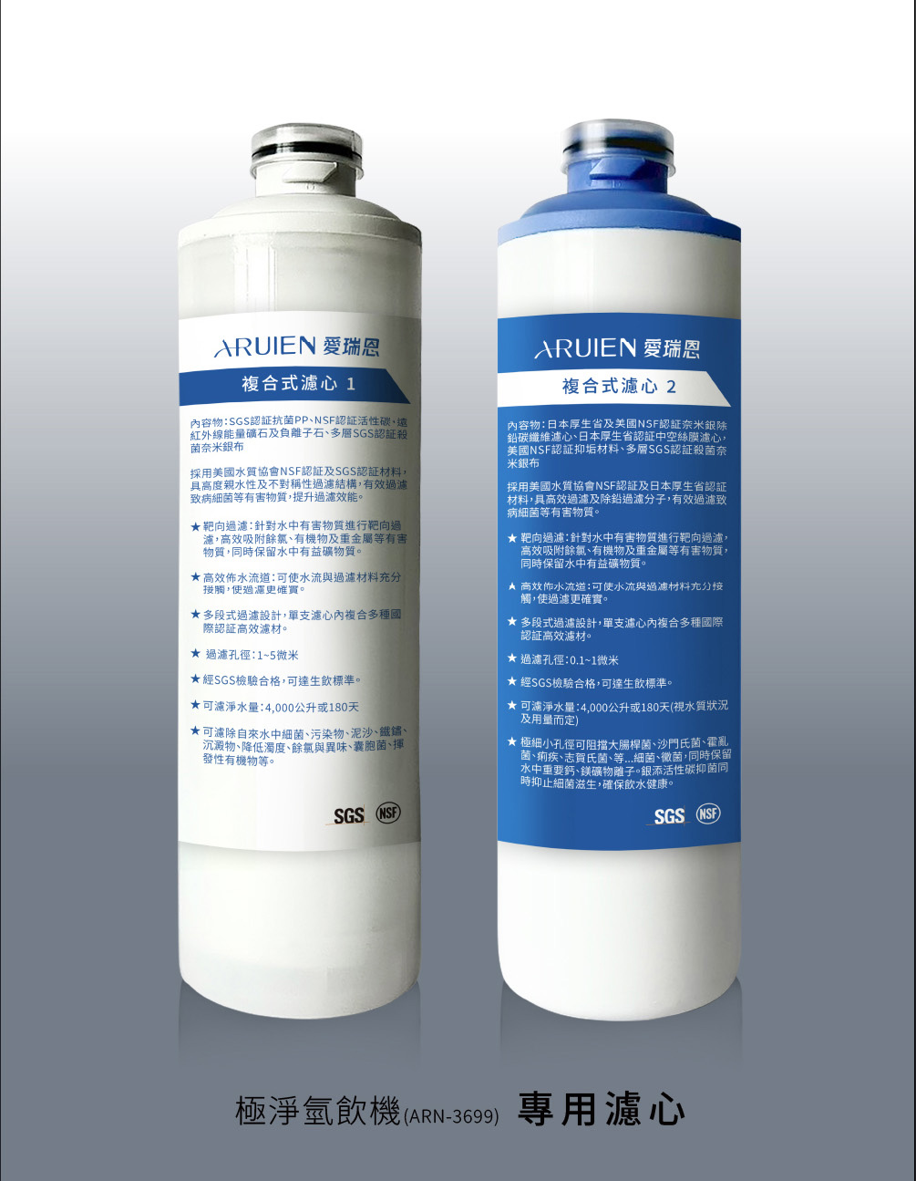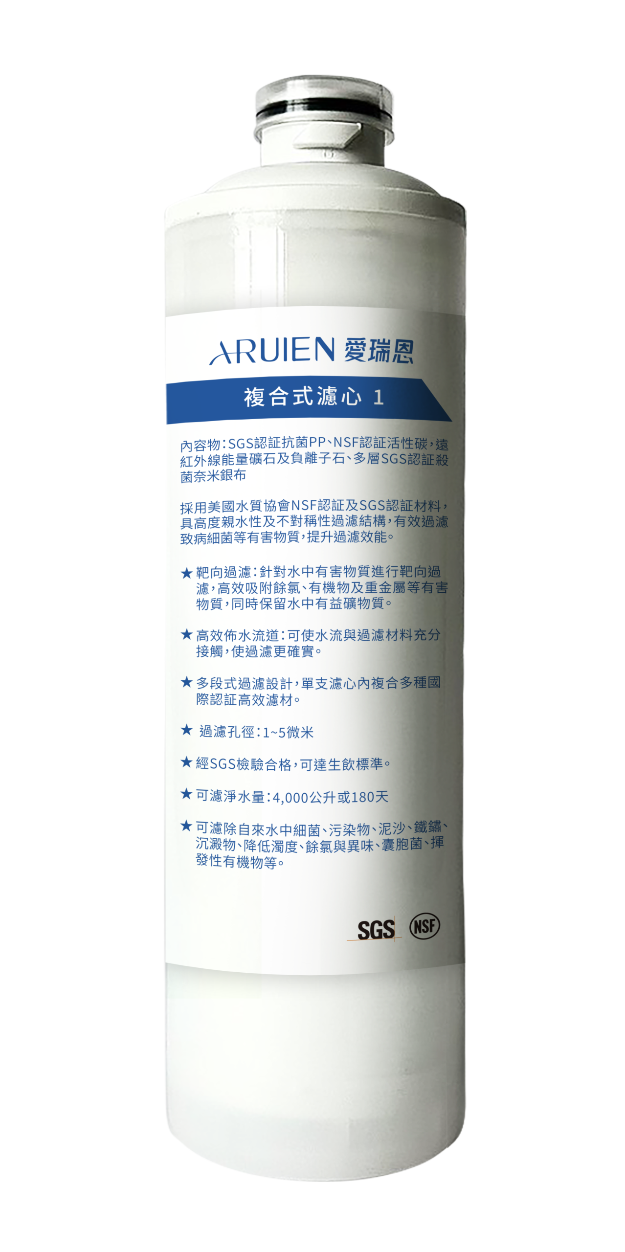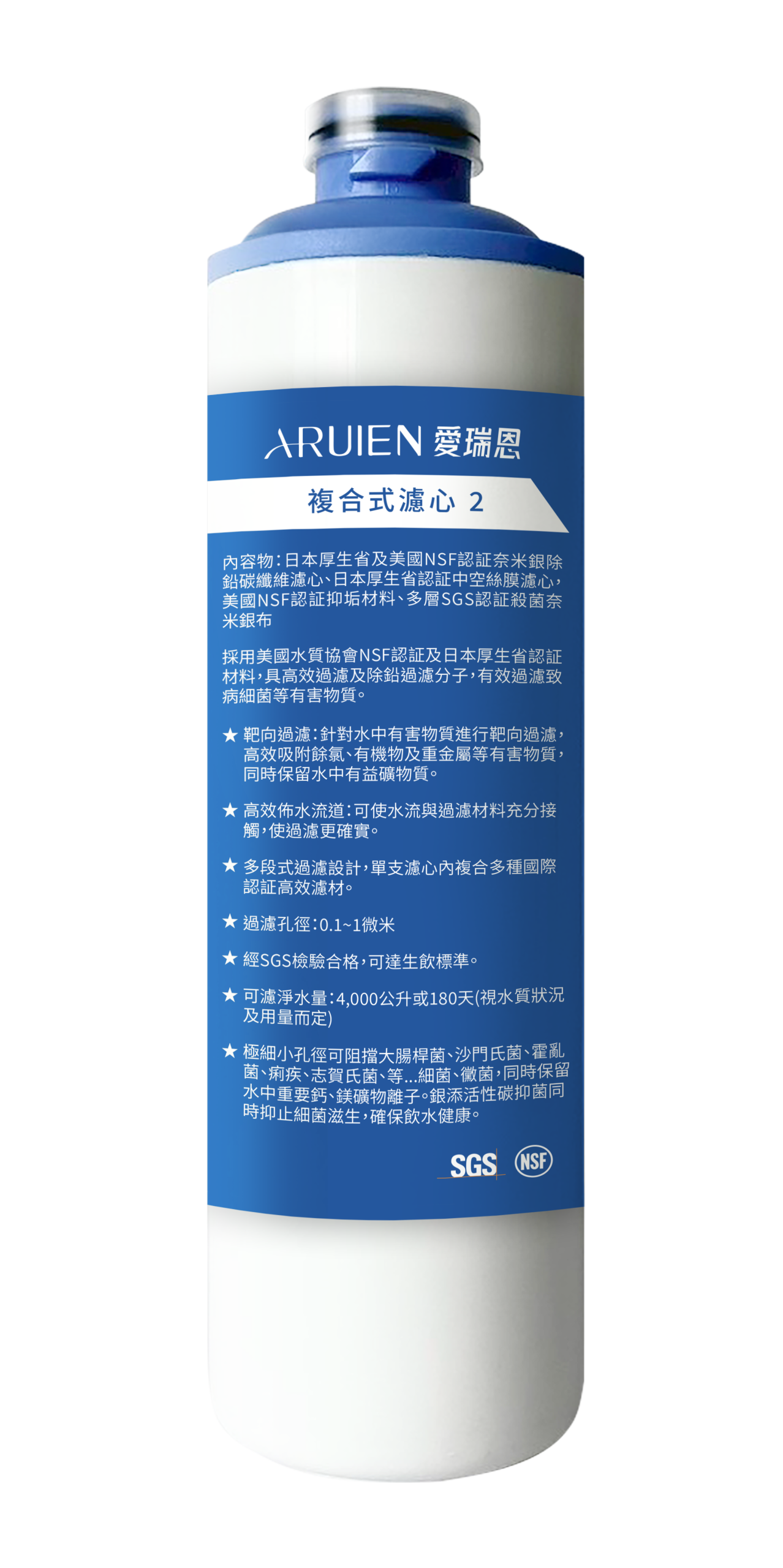 複合式濾心2 (540 公克) 內容物:日本厚生省及美國NSF認証奈米銀除鉛碳纖維濾心、日本厚生省認証中空絲膜濾心,美國NSF認証抑垢材料、多層SGS認証殺菌奈米銀布 過濾孔徑:0.1~1微米 經SGS檢驗合格,可達生飲標準。 可濾淨水量:4,000公升或180天(視水質狀況及用量而定)